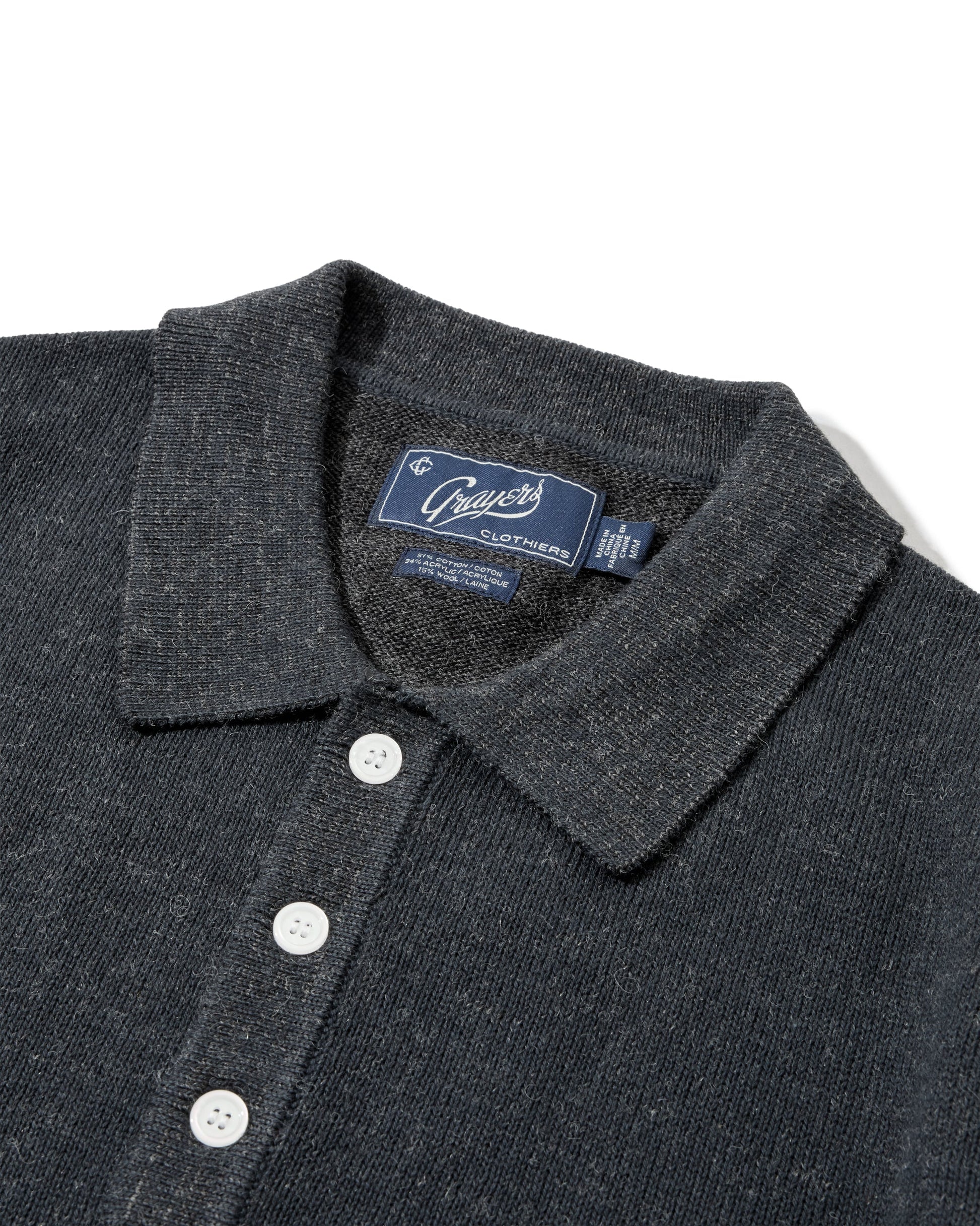 - Flat-knit rib collar, cuffs, hem, and placket