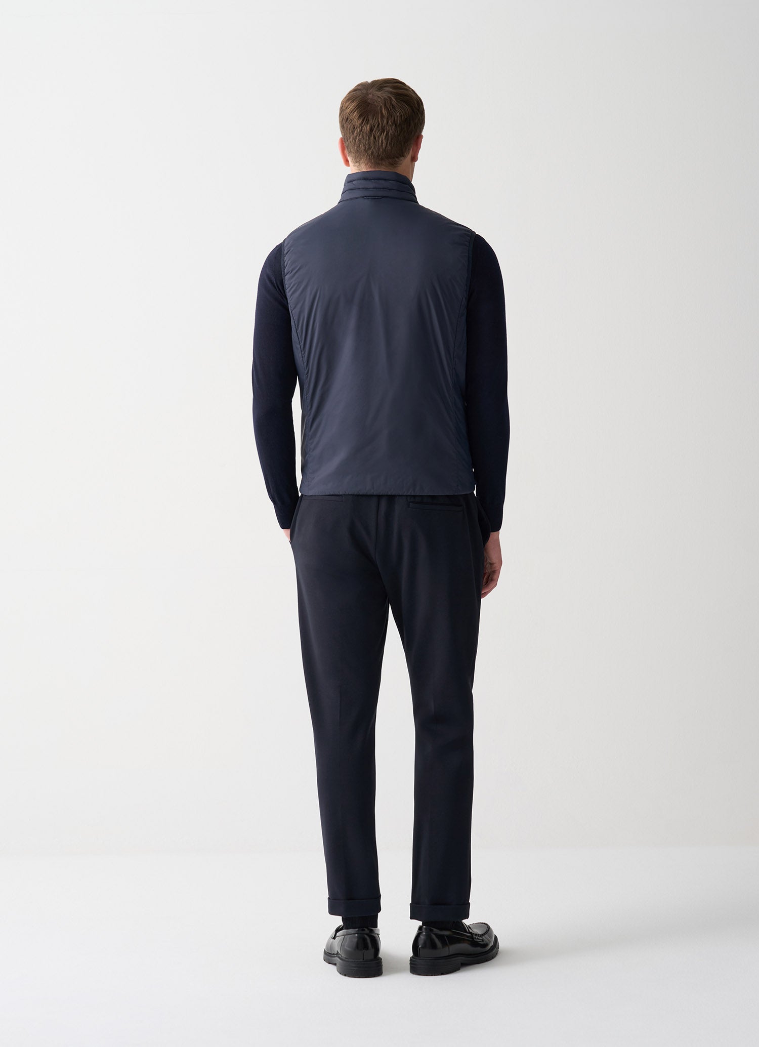 This vest is defined by its versatility and light weight, combining quilting on the front with a smooth back. The matching hanger loop on the back makes it practical to wear under coats, adding warmth and style to your outfit.