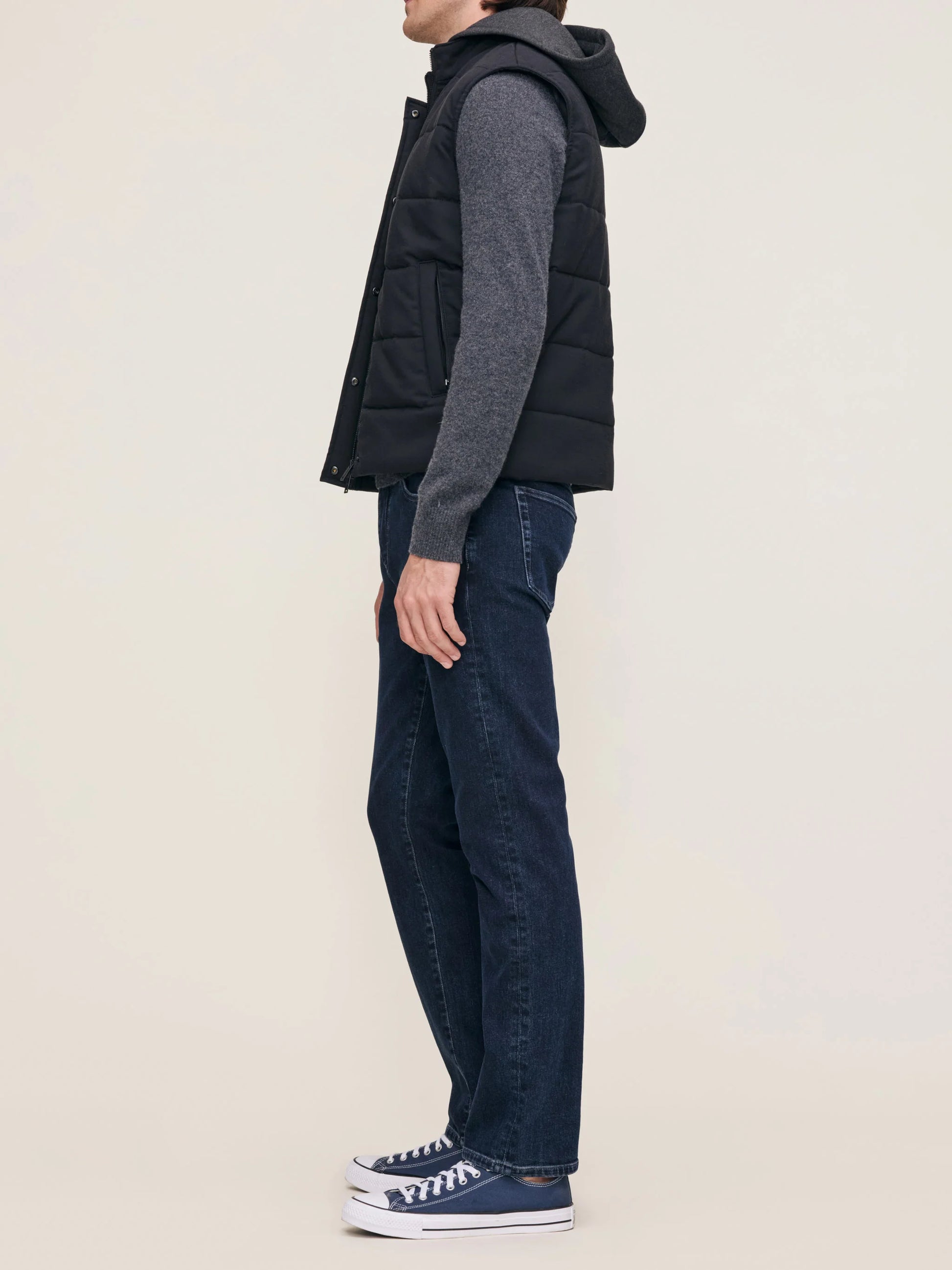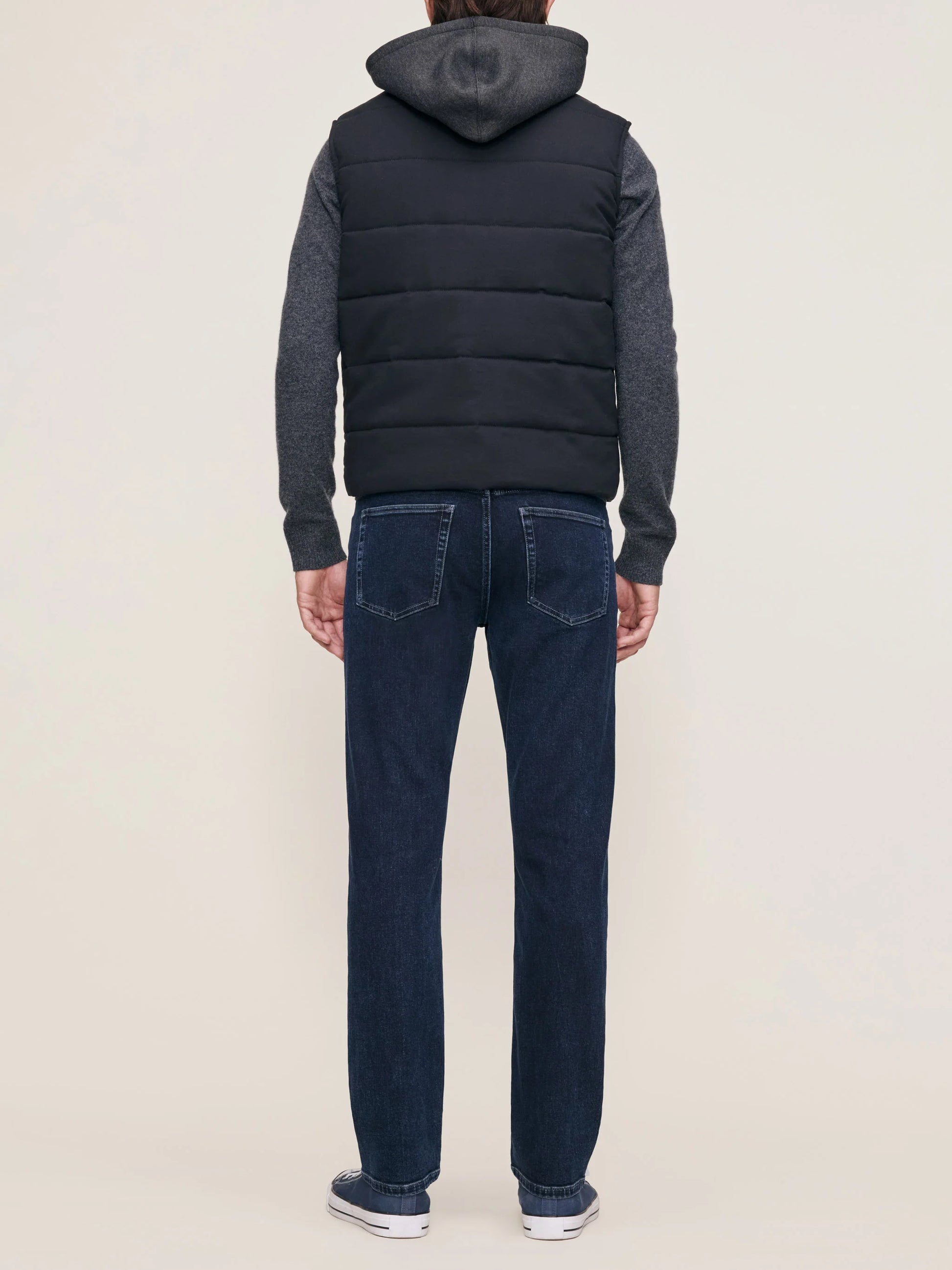 Ludlow is a dark, muted blue wash. It features silver hardware, grey stitching, a clean hem and a black back patch.