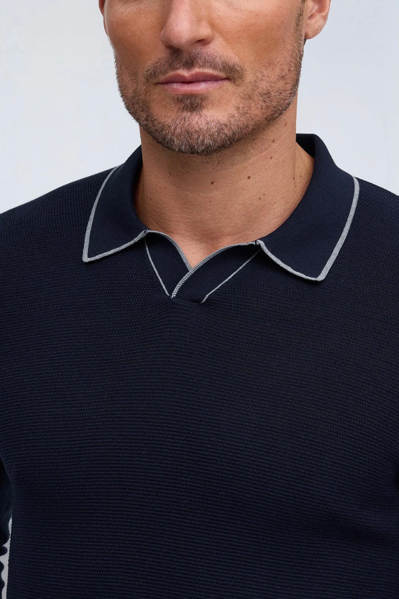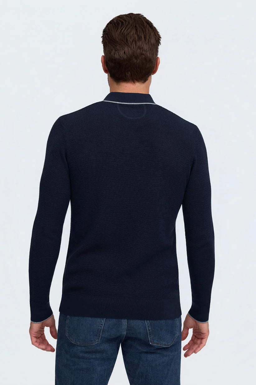 Crafted from a luxurious 55% silk and 45% cotton blend, this lightweight sweater features a textured stitch and polished trim detailing around the collar and sleeves for an elevated, modern look.