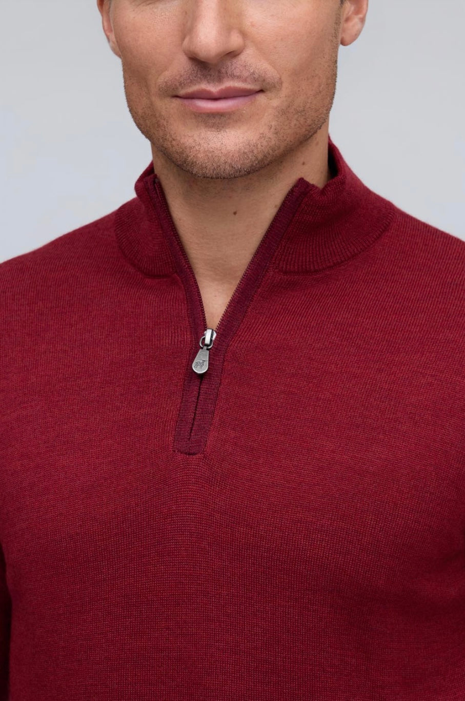 The Palmer is our elevated zip mock neck sweater with subtle tonal trim detail on the placket, hem, and cuff, and designed in 100% Extrafine Merino Wool. Style with any of our cotton-blend pants, Theo, Jasper, or Howard, for a contemporary look that will get you noticed.