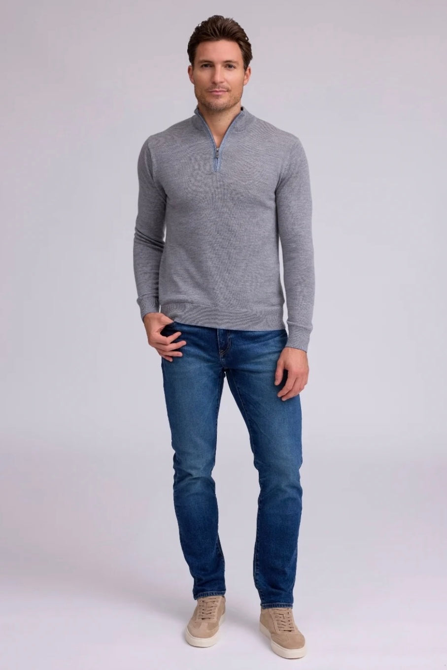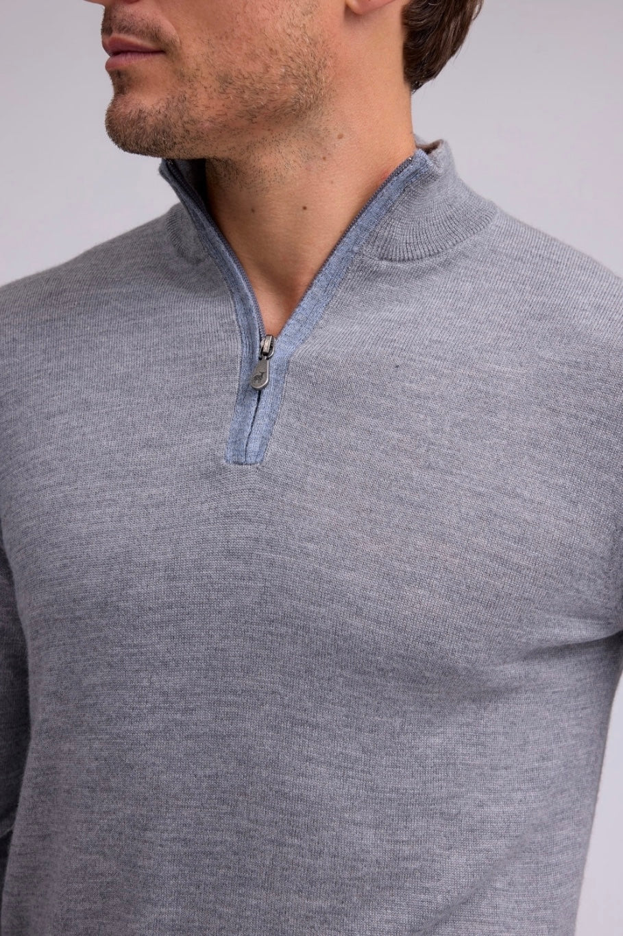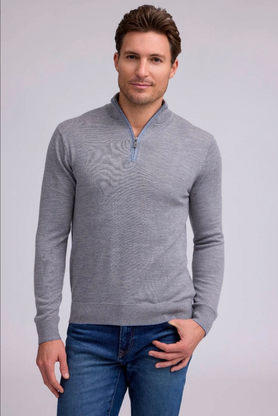 The Palmer is our elevated zip mock neck sweater with subtle tonal trim detail on the placket, hem, and cuff, and designed in 100% Extrafine Merino Wool. Style with any of our cotton-blend pants, Theo, Jasper, or Howard, for a contemporary look that will get you noticed.
